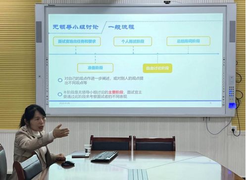 培训伊始,张世免老师从"职业"的定义和分类出发,让同学们更深层次的理解"职业生涯"的定义和分类,帮助同学们清楚职业定位和制定科学合理的职业生涯规划,在无领导小组培训中,张世免老师从"一般流程","如何选取自己的角色”,"加分项","减分项","评价标准"五个方面论述。张世免老师鼓励大家在决赛中积极参与,善于表达,掌握组织协调能力、口头表达能力,辩论的说服能力,反应灵活能力等,同时让决赛选手保持自信,情绪稳定,保持进取,以积极乐观的姿态从容应对比赛。