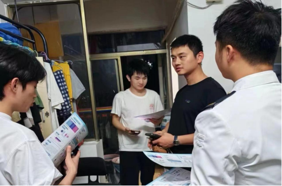 活动伊始,在武装部邢承勇老师和管理公司谭浩博老师的带领下,安全督察部的同学们分为两组深入员工宿舍,发放《征兵宣传手册》,与同学们面对面交流,从兵役登记、身体条件、入伍程序、优惠政策等方面详细介绍有关内容。邢老师分享自己的参军生活,介绍军队建设的伟大成就和一丝不苟的军队纪律。同时,邢老师结合往届毕业生的参军入伍体验,全方位、深层次就老员工参军有关政策进行详细解读,进一步帮助同学们算好参军入伍的经济账、升学账和发展账。